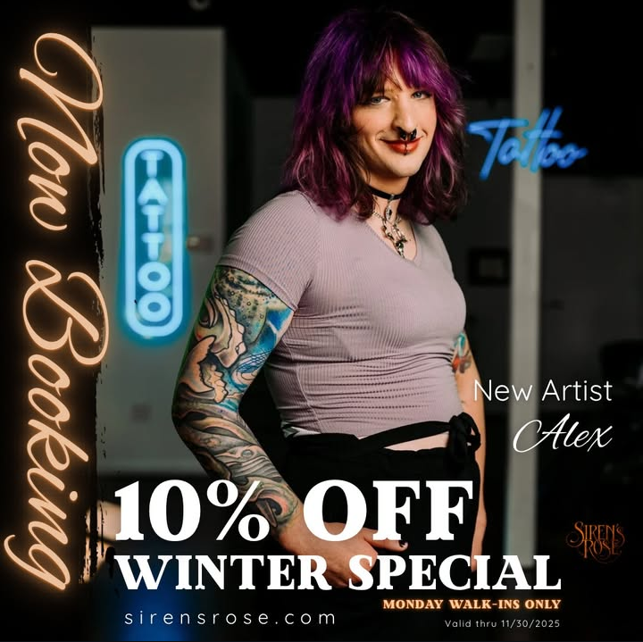 We're excited to welcome our new Artist Alex who just moved to town from Ohio to Michigan. To help build their clientele, and celebrate the start of the winter season, we're offering 10% off all walk-in tattoos every Monday! This will be valid through the end of January, so stop by and let's make your next tattoo a cozy winter memory!