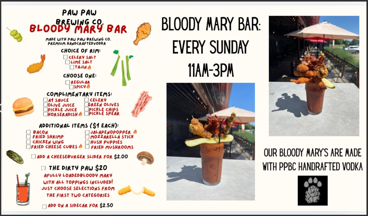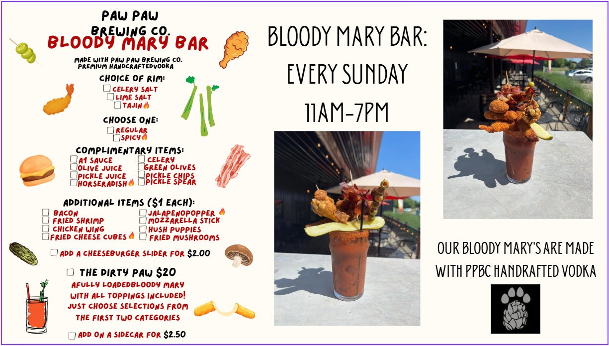 Treat your Sunday right at paw Paw Brewing's Bloody Mary Bar! Made with our own hand-crafted Vodka. So many options from a simple glass to a full meal! See you Sunday!