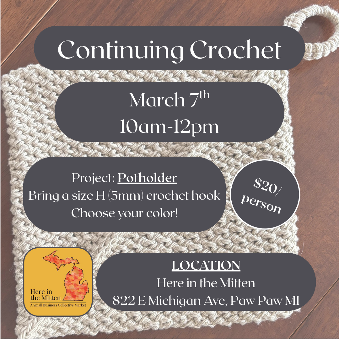 Continuing Crochet classes are designed to test your skills as a crocheter, and so you walk away with a newly completed project by the end of class! An expert will help guide you through the steps of completing the pattern, answer any questions you have, and provide an example of the completed project as reference. This Continuing Crochet class's project is a potholder, which practices the following skills; slip knot, chain stitch, single crochet stitch, and slip stitch. Yarn required for the project is included in the class price, and can be chosen upon arrival. Please bring a size H (5mm) crochet hook and a tapestry needle with you to class. This session of Continuing Crochet is scheduled for March 7th from 10am-12pm. Reserve your spot today as spaces are limited.