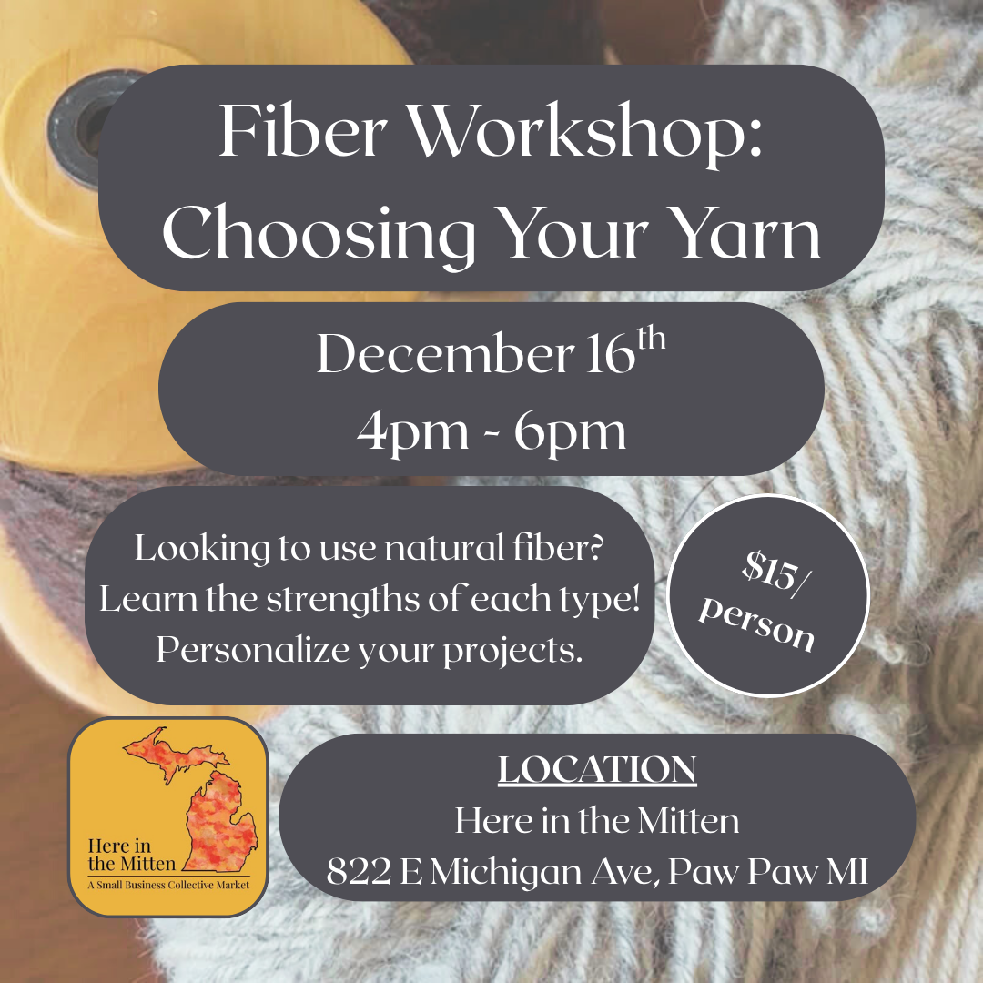 This session of Fiber Workshop: Choosing Your Yarn is scheduled for December 16th from 4pm-6pm. Reserve your spot today as spaces are limited.
