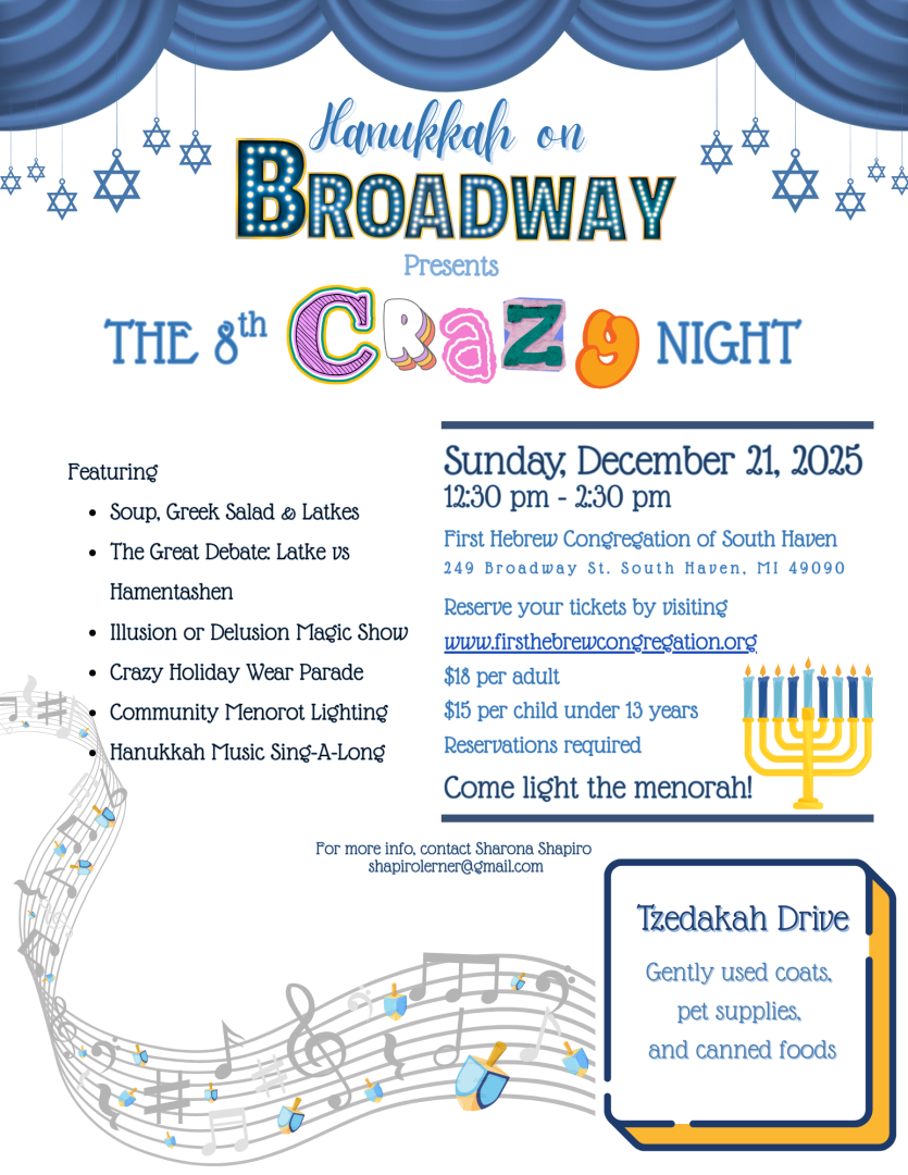 All are invited to this year's Hanukkah on Broadway: The Crazy 8th Day, 12:30 pm-2:30 pm on Sunday, December 21 at First Hebrew Congregation of South Haven. The afternoon will feature magician John Dudley, a crazy Hanukkah dress up parade, a delicious lunch including a variety of traditional and not so traditional latkes, a satirical Broadway first act show-The Great Debate: Latke vs Hamantashen and of course Hanukkah candlelighting and sing-a-long. First Hebrew Congregation is also asking guests to bring new or lightly worn winter coats, boxes and cans of food and pet supplies for our Winter Tzedakah Drive.