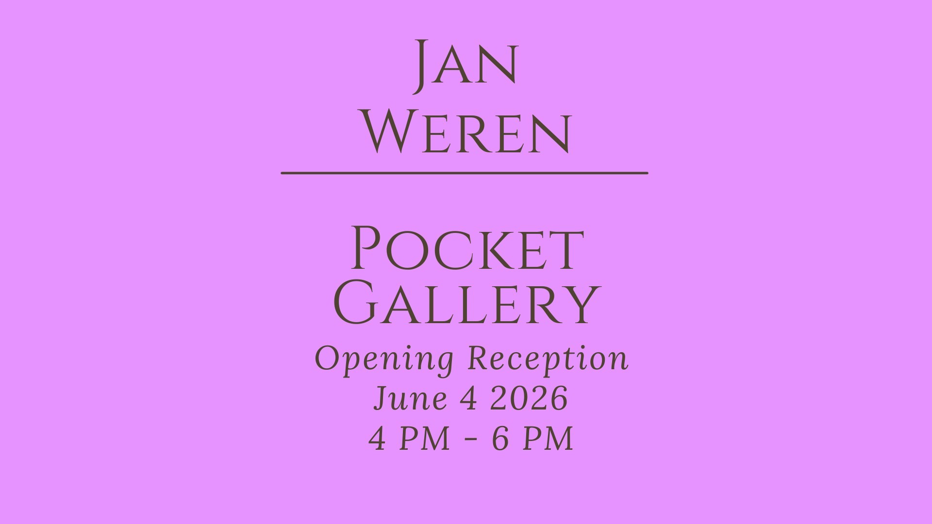 Join us Thursday, June 4, from 4 - 6pm for the opening reception of Jan Weren's pocket gallery! This exhibition runs from June 5 through June 27.