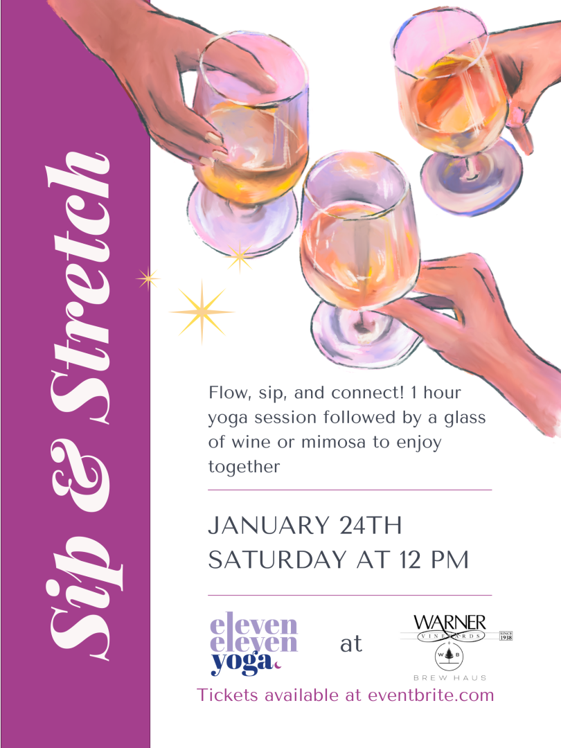 Join Eleven Eleven Yoga for a relaxing and uplifting experience at Warner Vineyards! This all-levels yoga class is designed for everyone, whether you’re a beginner or an experienced yogi. You’ll be guided through a gentle, flowing 1-hour practice that helps you unwind and reconnect with yourself in this beautiful winery setting.