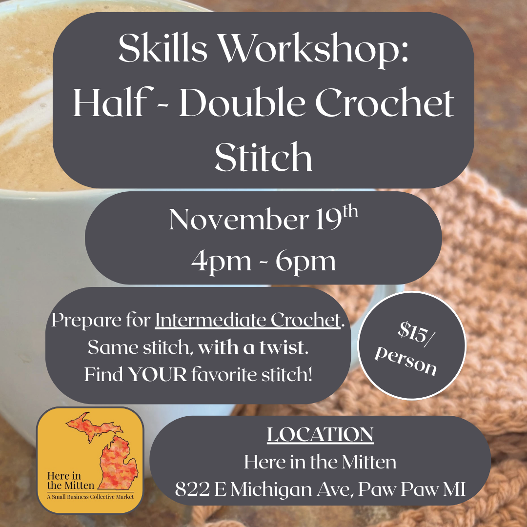 This session of Skills Workshop: Half-Double Crochet Stitch is scheduled for November 19th from 4-6pm. Reserve your spot today as spaces are limited.