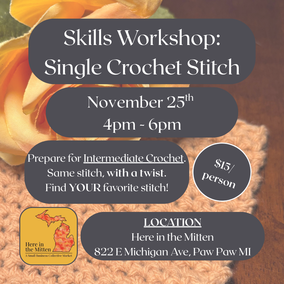 This session of Skills Workshop: Single Crochet Stitch is scheduled for November 25th from 4-6pm. Reserve your spot today as spaces are limited.