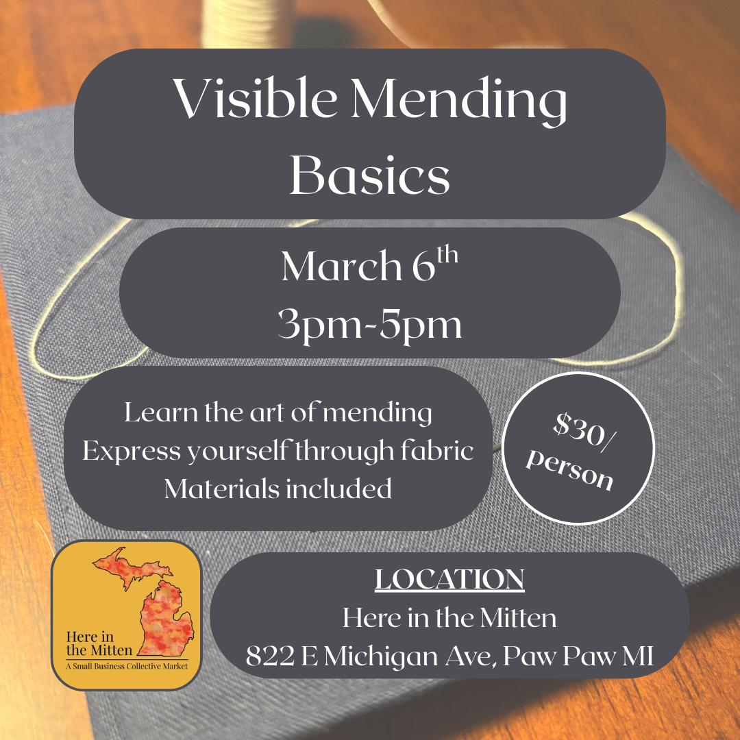 This session of Visible Mending Basics is scheduled for Friday, March 6th from 3pm-5pm. Reserve your spot today as spaces are limited.